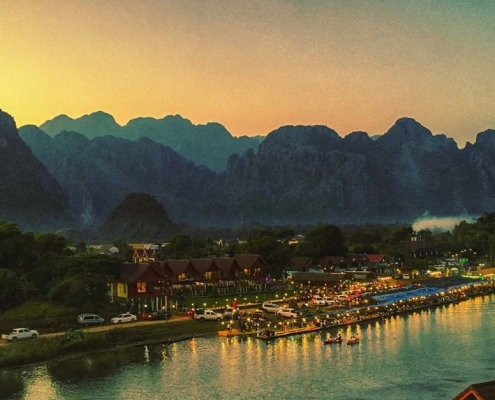 A dreamlike landscape of bizarre limestone mountain peaks and sheer cliffs with the Nam Song River bisecting the town.